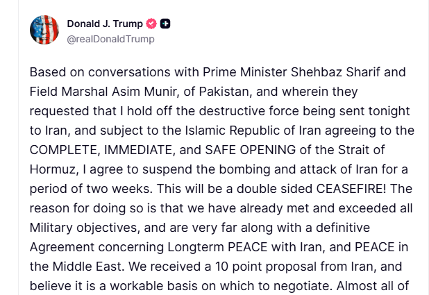 TBSラジオに出演し、「この戦争は長引く」と言い切ってから約1時間後、トランプが、個人のSNS上に、「イランがホルムズ海峡の安全な開放に同意することを条件に、攻撃の2週間停止に同意する」とUP。完全停戦ではないにせよ、急転直下の動き!☹️。(写真:BBC)