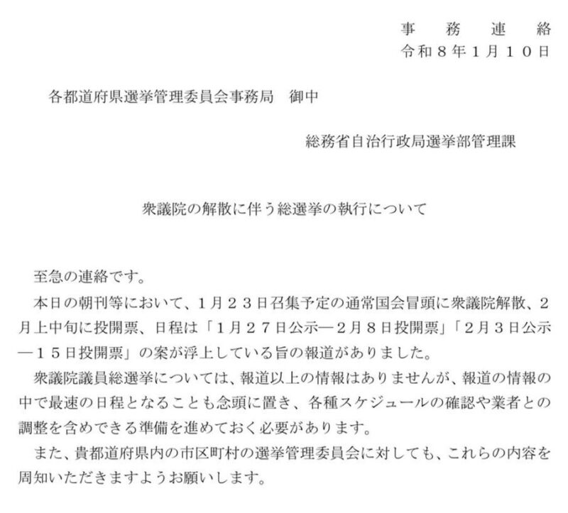 これは、総務省が各都道府県に出した事務連絡。こういうのが出てしまうと、もう解散風は止まない。やれば、自民は単独過半数獲得の可能性もあるし、国民民主と組めば衆参ともに安定多数行くかも。ただ、負けるリスクも背負う。今井さんらに強く進言されたのだろうけど、勝負師だね👏。